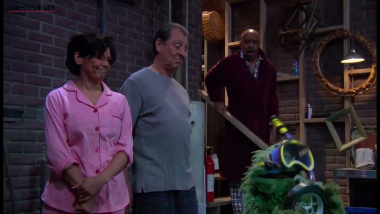 SCENE: At night, we see Gordon at the beginning of the scene. Gordon hears water sloshing and Ernie and Bert's voices. He thinks that there must be a problem and decides to go their apartment. He sees the two start floating by in their beds! Gordon sends Susan to get Maria and Luis. Bert and Ernie get dried off and Gordon assures them Maria and Luis are fixing the pipe and now they are safe. They go to bed, but there is a problem because Ernie cannot sleep without Rubber Duckie and wants to get him from downstairs. Gordon and Susan stop him, they express that Rubber Duckie will be fine in the water. Gordon goes downstairs to check. Luis finds the blueprints to the building and he learns there is a red valve handle to shut off the water. When Maria turns the red valve, she sees Oscar with a snorkel, she surprises and this causes her to drop the handle into the water. Ernie sleeps, but now Bert cannot sleep, because he misses Bernice. Maria looks the blueprint again and she finds they miss a curved pipe. Maria and Luis repair the pipe. It works as a temporary pipe. Finally Ernie and Bert sleep.